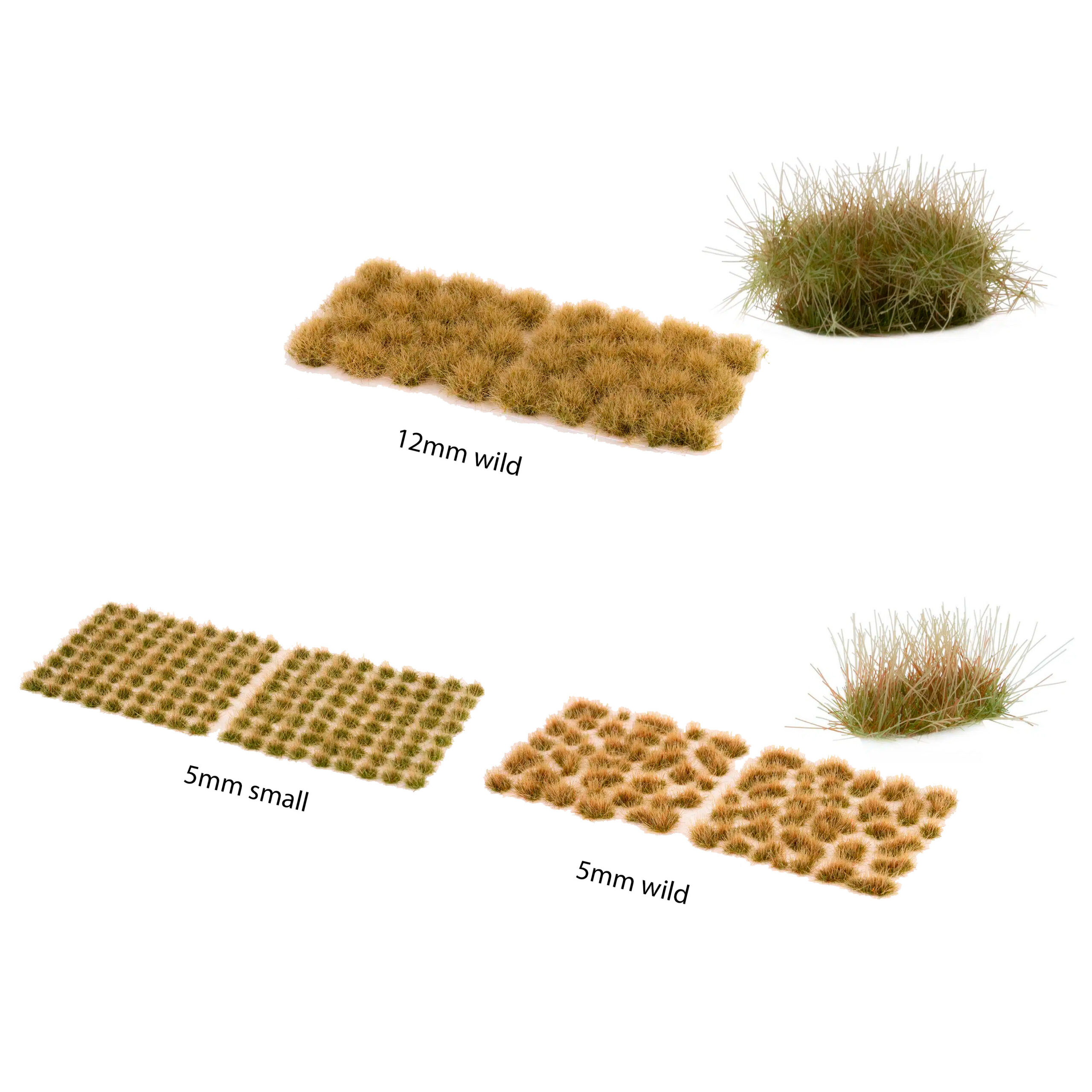 • 4mm: Either to be used scattered on plant-scarce environments, or more densely, recreating mature cereal crops or transitions in grass heights. Can represent tall grass or small bushes for 15mm miniatures, or low grass for 28mm miniatures